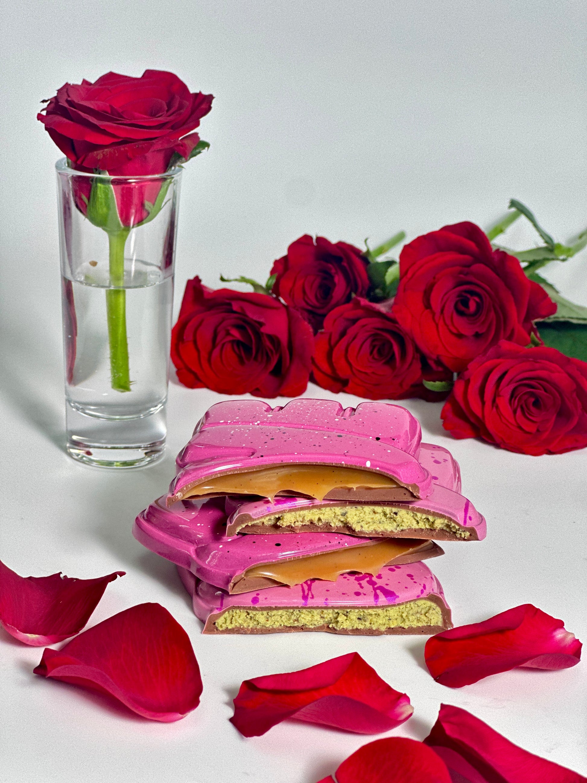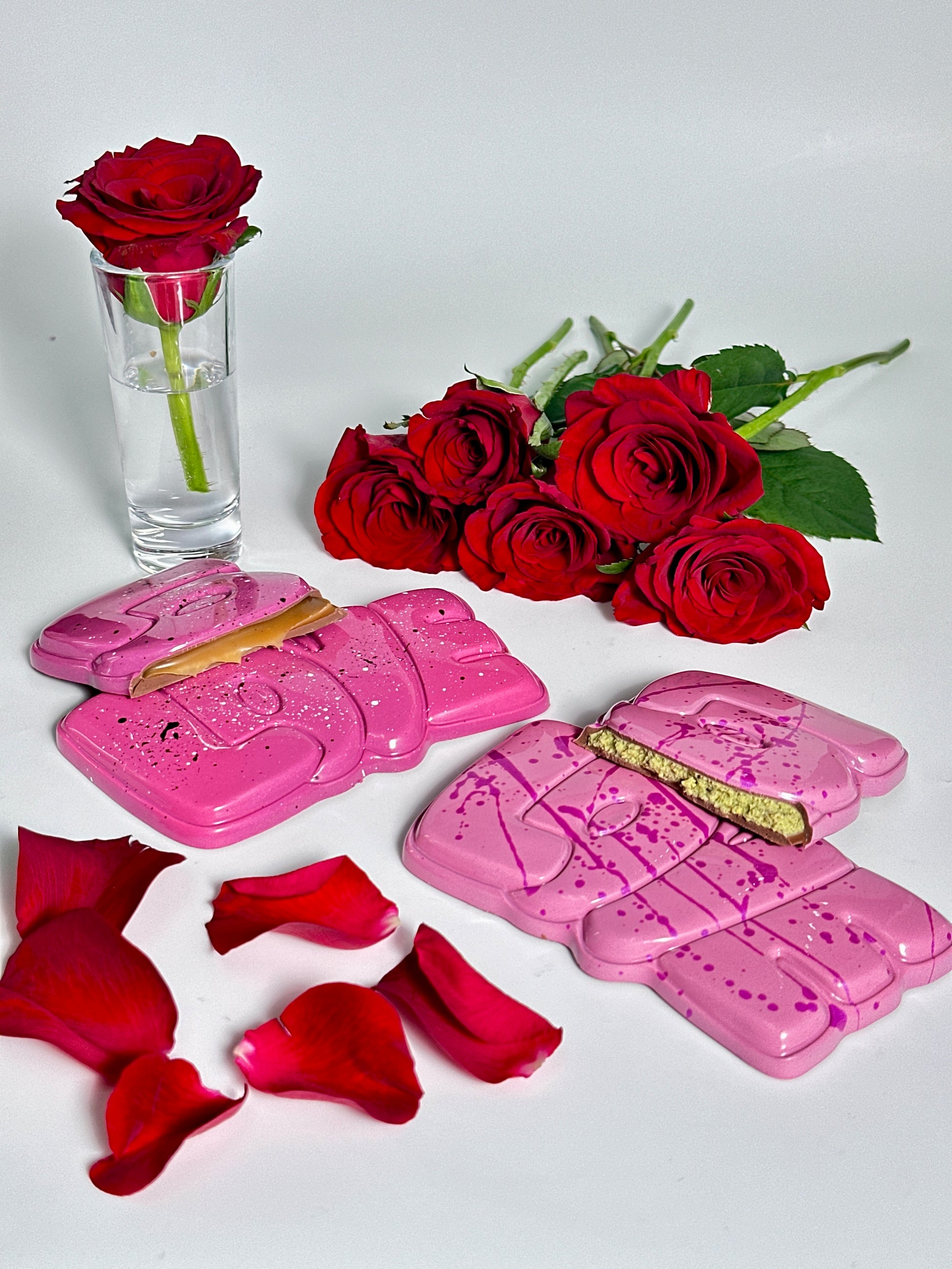 Discover the exquisite charm of our Love Chocolate Slab, a decadent treat crafted from the finest Belgian milk chocolate. This mesmerizing creation, delicately shaped to convey the essence of "love," offers a delightful selection of two flavours, a smooth golden caramel just like your favourite Caramello Bear or indulgent pistachio praline fillings, perfect for your love. Beautifully decorated in two shades of pink and showcasing our signature abstract design. This chocolate masterpiece is the perfect romantic gift for Valentine's Day, embodying elegance and indulgence in every delicious bite.