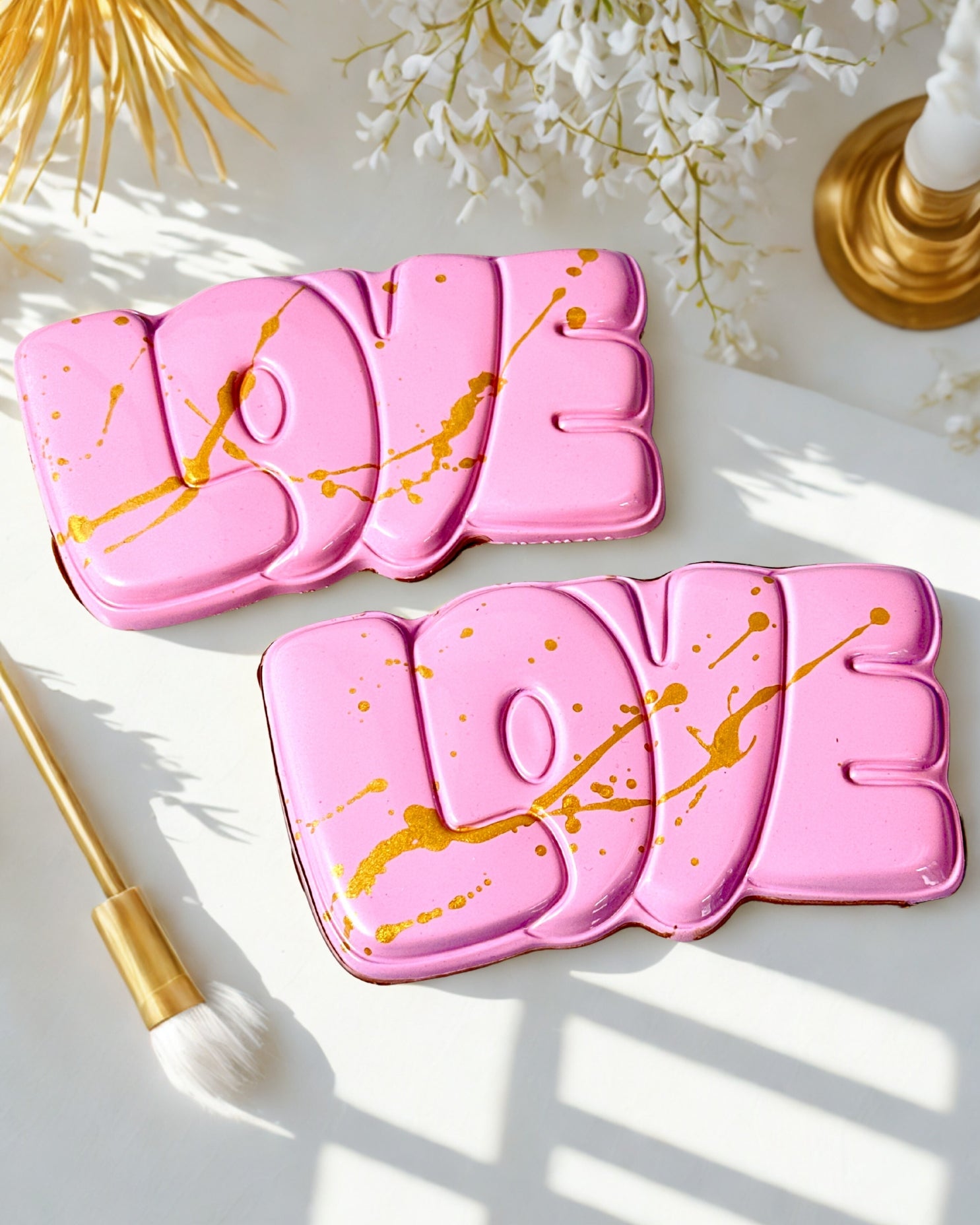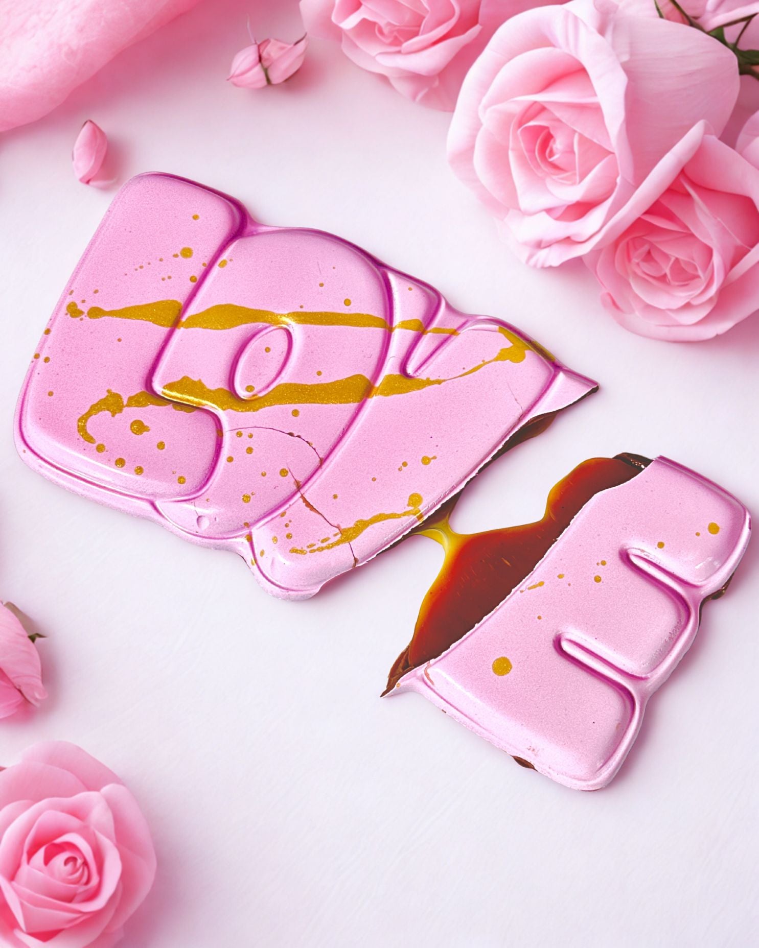 Discover the exquisite charm of our Love Chocolate Slab, a decadent treat crafted from the finest Belgian milk chocolate. This mesmerizing creation, delicately shaped to convey the essence of "love," offers a delightful flavour of a smooth golden caramel just like your favourite Caramello Bear, perfect for your love. Beautifully decorated in a shade of pink and showcasing our signature gold abstract design. This chocolate masterpiece is the perfect romantic gift for Valentine's Day, embodying elegance and indulgence in every delicious bite.