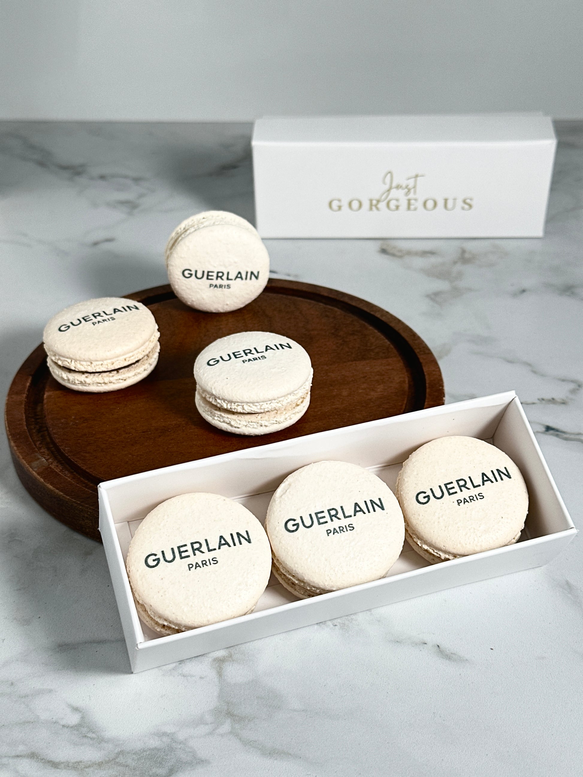 A box of 3 macarons with a custom print on the macaron shell. Each macaron is filled with our signature ganache filling our your choice. All our macarons come standard in our white branded gift box and macarons are made to order.