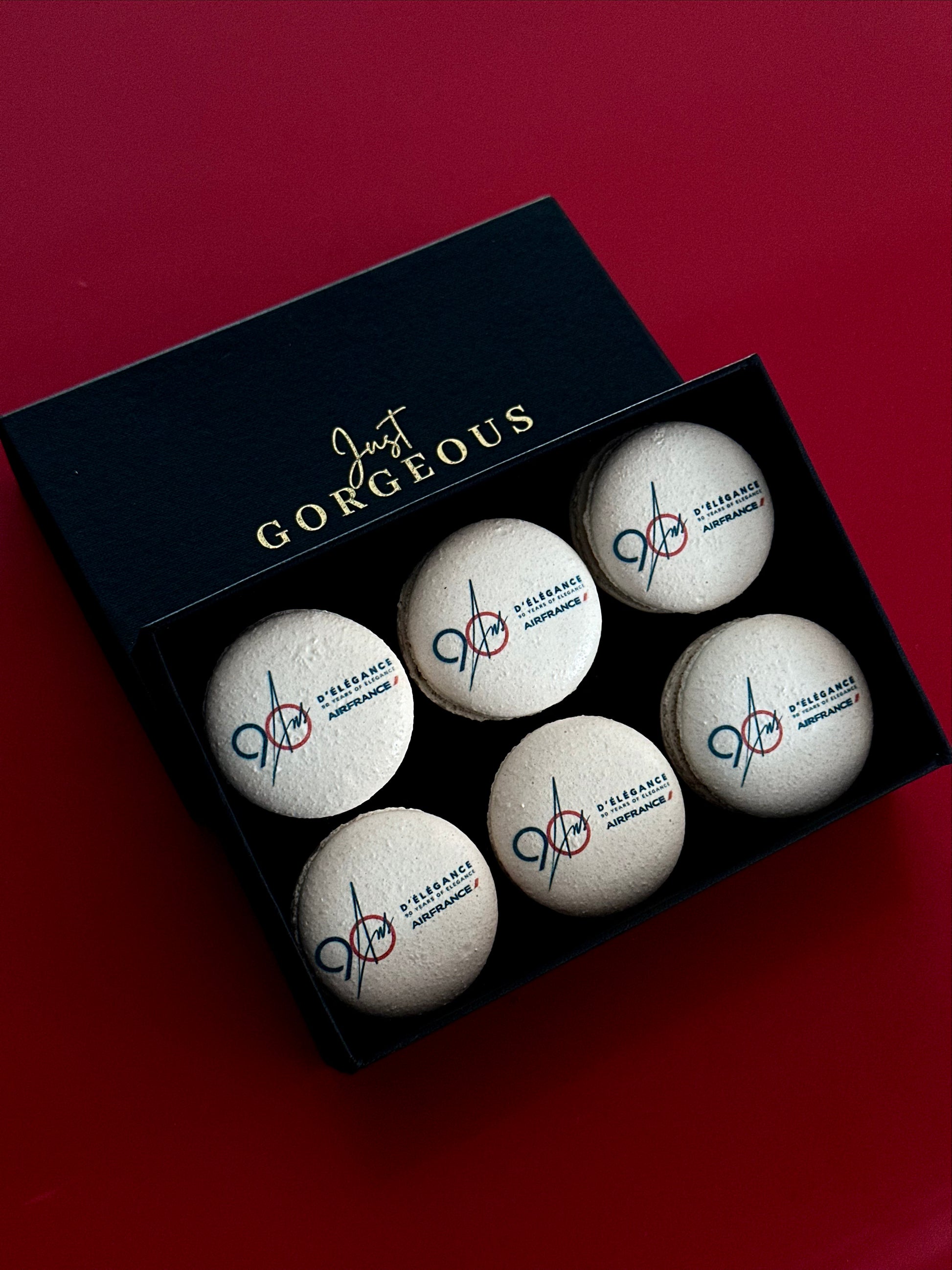 A box of 6 macarons with a custom print on the macaron shell. Each macaron is filled with our signature ganache filling our your choice. All our macarons come standard in our white branded gift box and macarons are made to order.