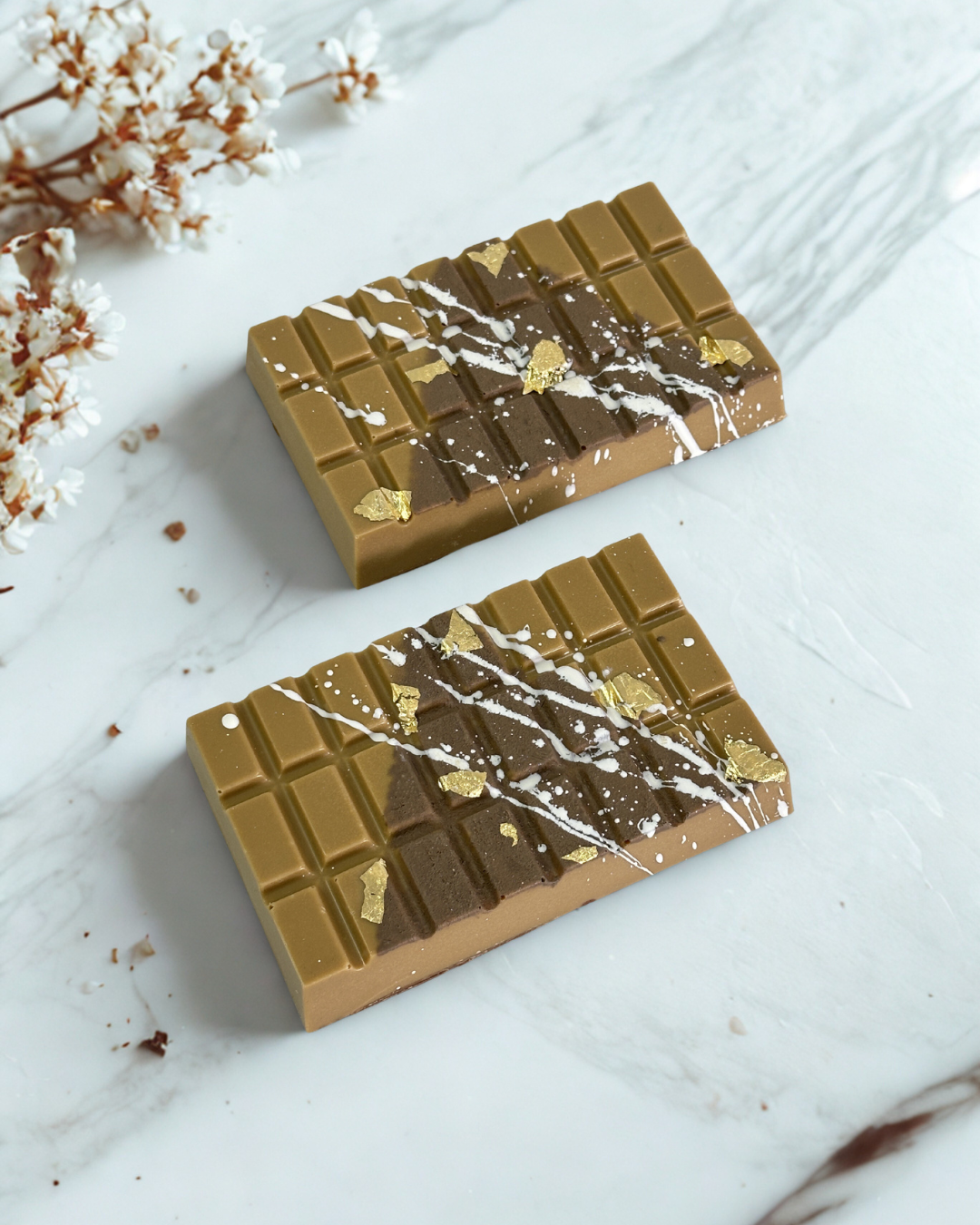 Indulge in the opulence of our exquisite chocolate bar, a regal treat that transports you to the enchanting sands of Egypt. Each bite unveils a harmonious blend of rich gold chocolate, layered with sumptuous cinnamon caramel and velvety yoghurt ganache, all crowned with a delightful crunch of chocolatey feuilletine. Adorned with elegant gold and white sprinkles, this chocolate bar is not just a confection; it’s a luxurious experience fit for the kings and queens of ancient times. Elevate your palate and savour the taste of royalty today.