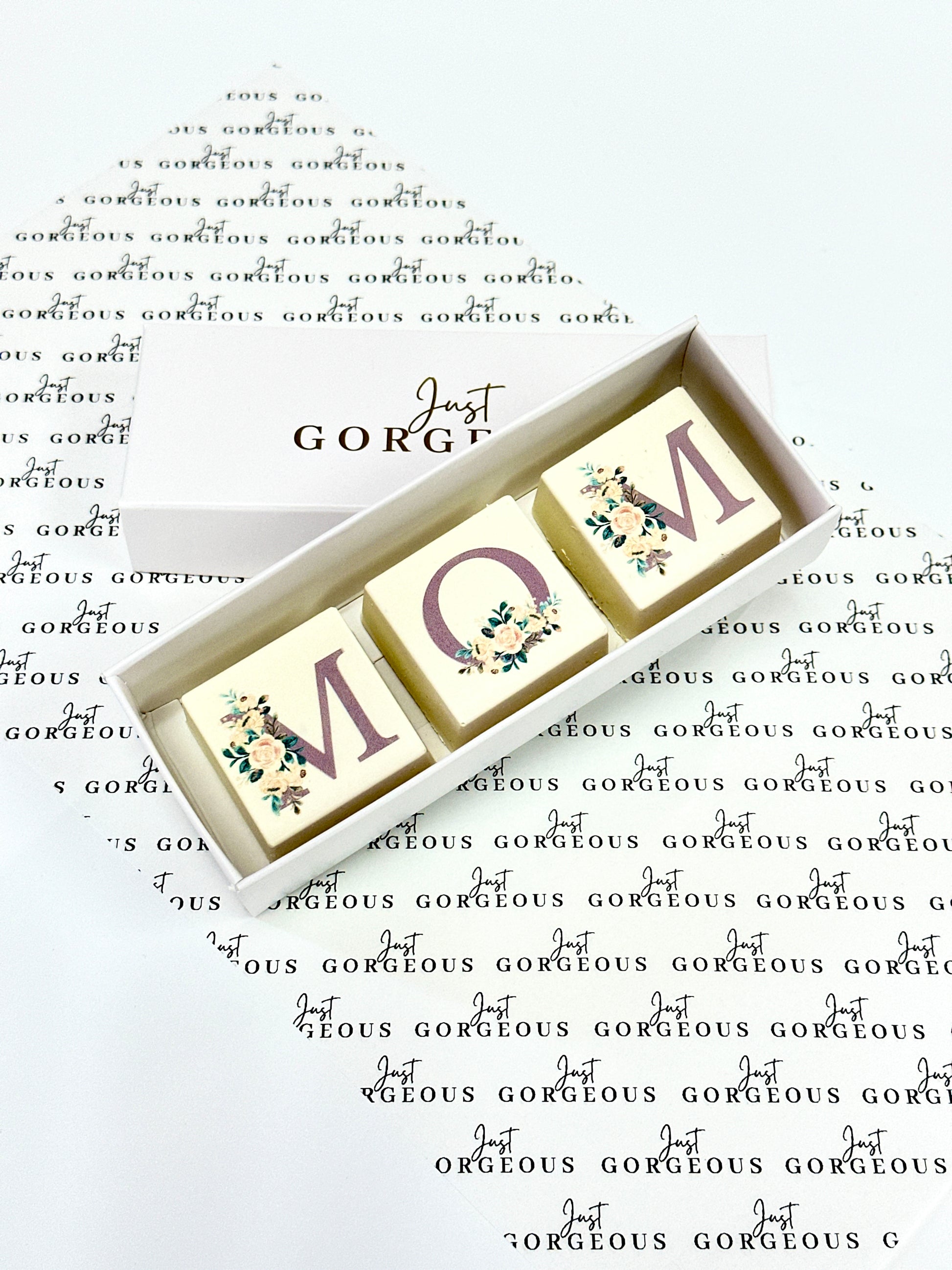 Indulge in the exquisite delight of our custom printed chocolate squares, elegantly crafted to spell "MOM." Each decadent piece is filled with a luscious strawberry cheesecake center, perfectly complemented by a delicate layer of buttery shortbread biscuit. This luxurious treat is not just a gift; it's a heartfelt expression of love, making it the perfect way to celebrate the extraordinary woman in your life this Mother's Day. Elevate your gifting experience and make her day truly unforgettable.
