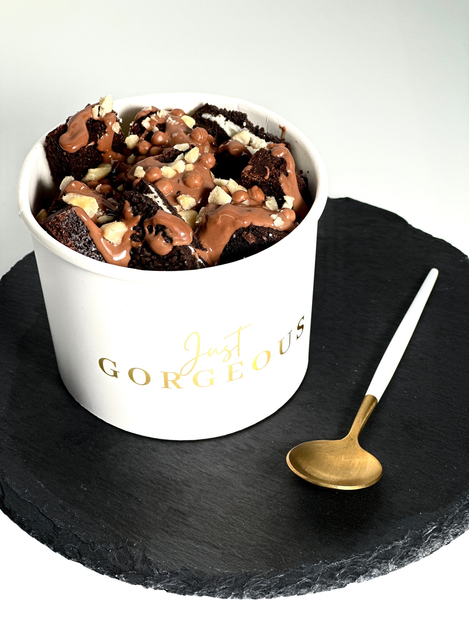 Each bowl is filled with pieces of our decadent brownies, smothered in Belgian chocolate sauce and finished off with toppings of your choice.